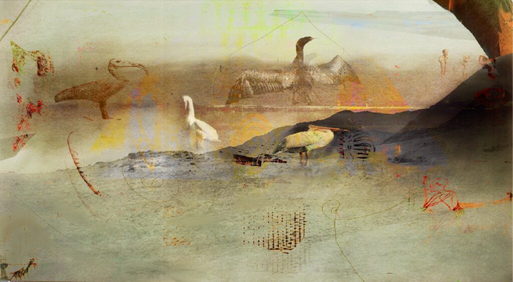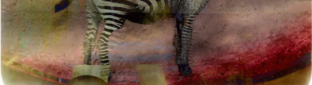 My work is spontaneous and intuitive. I use the i-Ching, rather than the analytical and often unreliable mind. The upper half of this image shows a ghostly ethereal image of one of my ancestors, perhaps representing the spiritual, subconscious or transcendent. The scratches evoke a sense of hidden threads connecting the visible and invisible realities. The earthly animals, zebras and birds may represent the physical and material world. This is a dialogue between the spiritual and material worlds which I have always wanted to somehow incorporate as one glorious experience.