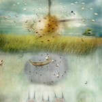 The Hipstabird series begins with the morning light and life is playful, happy and whimsical. Multi-dimensions are shown with subtle interaction between layers (1-6). Orange pods evolve, representing life and rebirth (5,6). The long somewhat unrecognizable beak on the left (8) reaches into the basket and source of life, giving and receiving from both worlds, providing that essential connection that this series so subtly expresses. As the story develops, the chicken’s heads began to disappear (10-16), no red combs for accent or color and it seems as if a transformation is occurring. The birds are becoming softer and conveying a sense of calm. In image 11, the boat is sinking and acting as a vehicle for the birds to move into a different place. Simultaneously, another boat is picking them up on the other side and they appear to be landing softly. This transition is subtle and yet despite the ease in which this shift occurs, we don’t underestimate the fact that things are changing into yet another unknown form. The series ends with a quiet landscape in which the new transition begins with seagulls leading the way (17-20).
